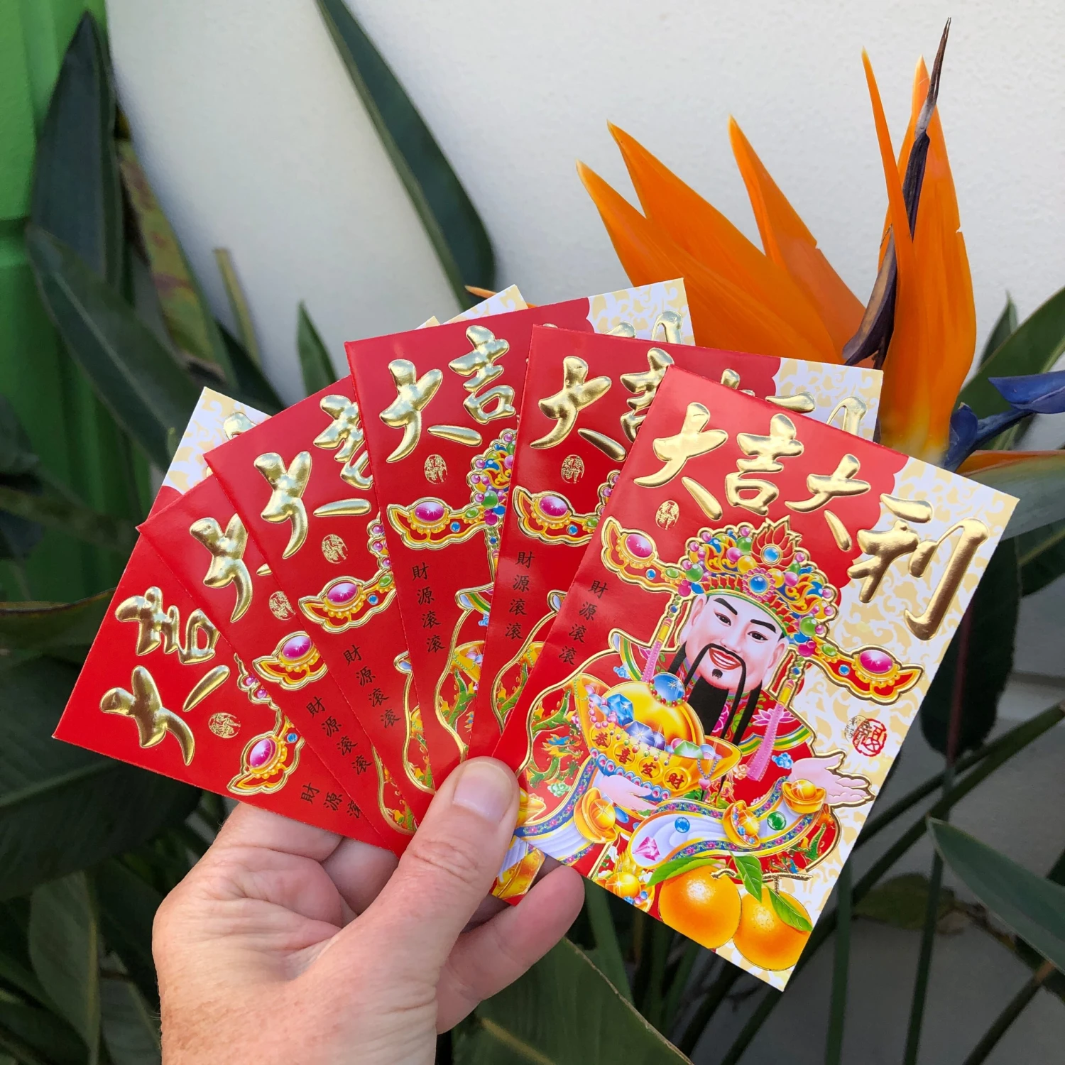 God of wealth design with traditional Chinese decorations. Chinese characters and highlight decorations in metallic gold. Vibrant red gloss paper envelopes (6 per pack – all 6 envelopes in pack have same design).