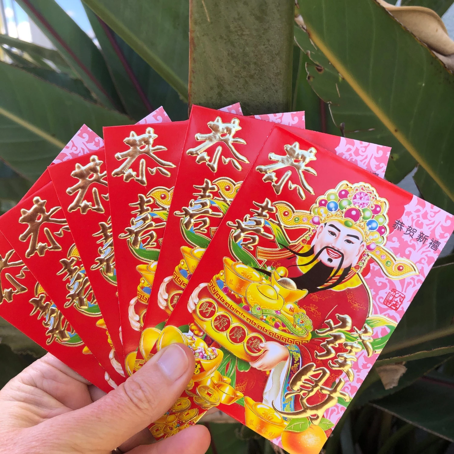 God of wealth design with traditional Chinese decorations. Chinese characters and highlight decorations in metallic gold. Vibrant red gloss paper envelopes (6 per pack – all 6 envelopes in pack have same design).