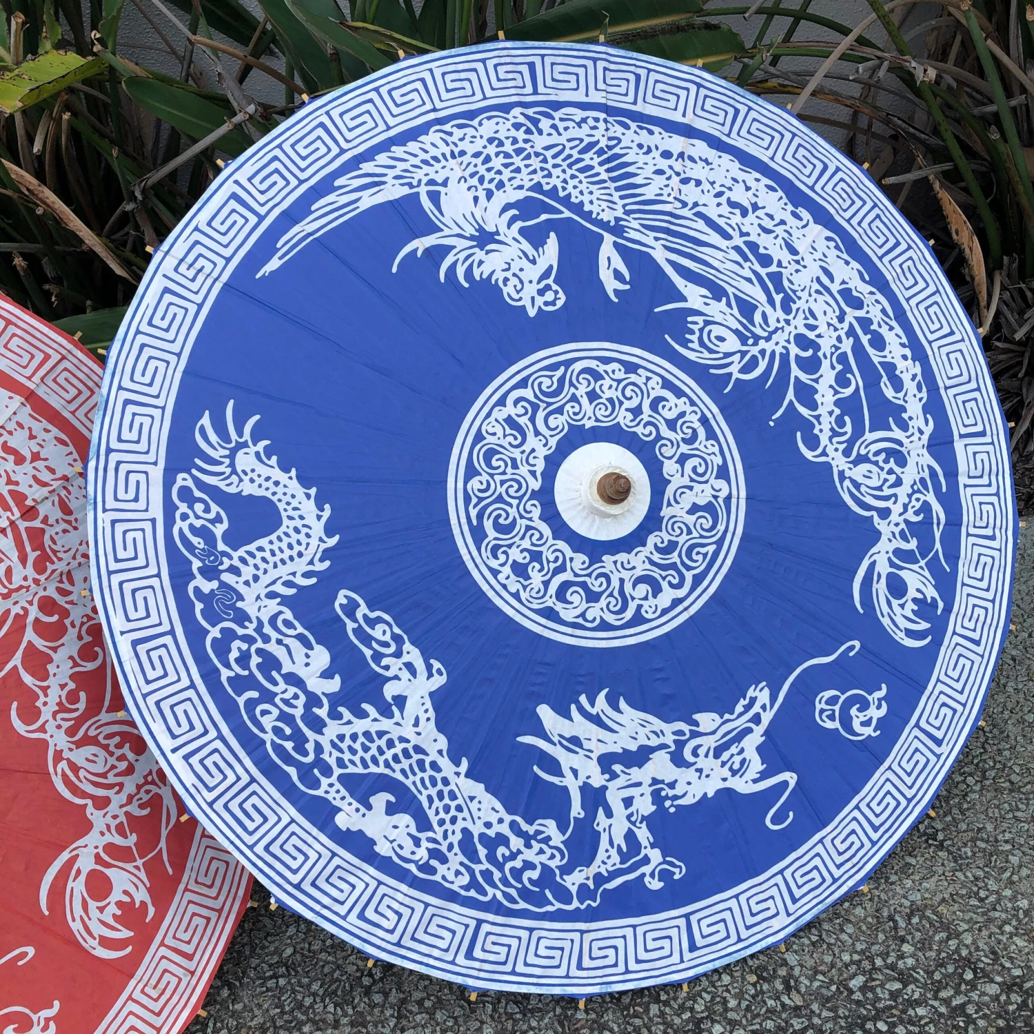 Highest quality bamboo and paper parasol for events, Chinese New year decorating, Chinese weddings. Luxury designer oriental parasols – dragon and phoenix print