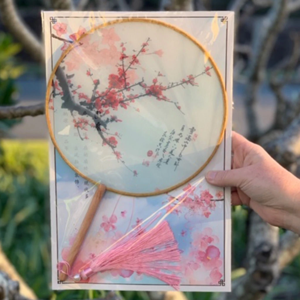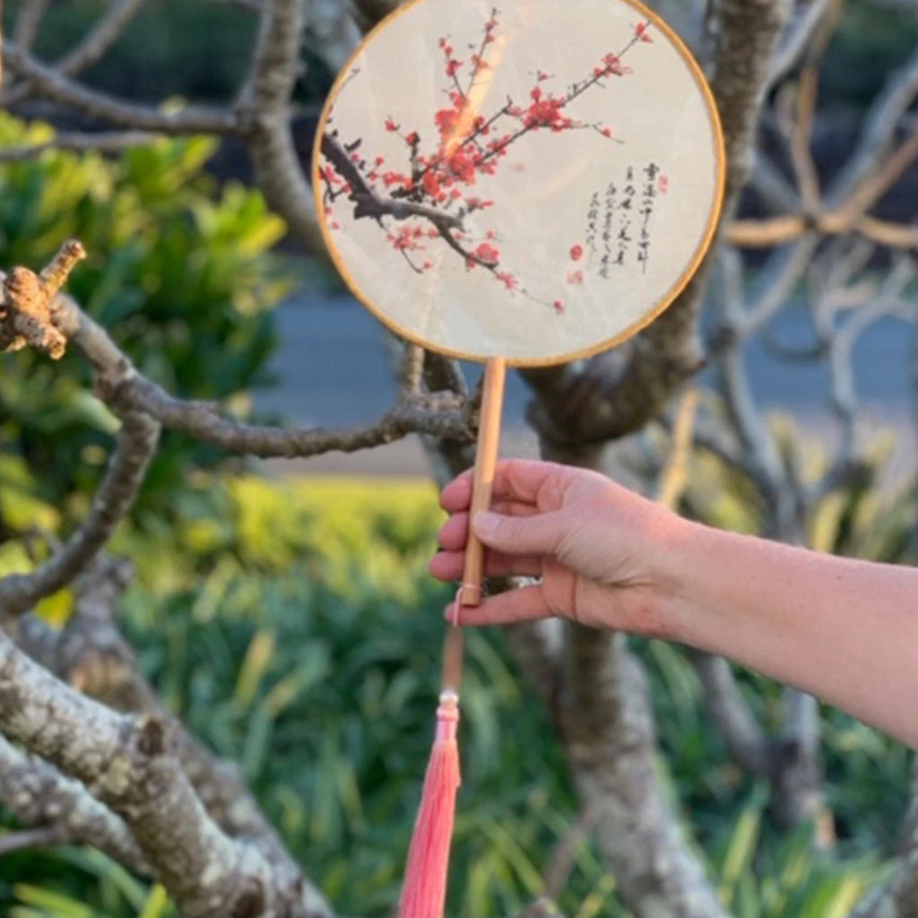 Luxury range, highest quality round silk fan with lacquered bamboo frame, silk brocade edging, pink tassel tail. Silk fabric with stunning painted red cherry blossom design and Chinese poetry calligraphy.