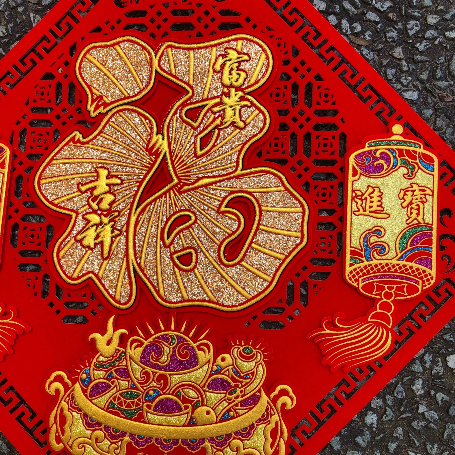 Vibrant Red with raised glittery decorations to give a slight 3D effect! Firecracker and golden ingot decorations. Laser cut background with traditional Chinese print.
