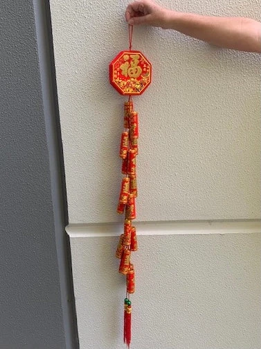 Long hanging decoration – 12cm x 100cm (firecracker size 8cm long), (top octagon 12cm x 12cm x 3cm). total height from top of hanging cord to bottom of tail 105cm.