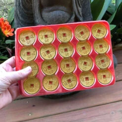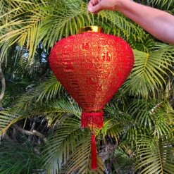 Red velvet with metallic gold and glitter decorations of golden ingots, blossoms and Chinese characters for prosperity / good luck wishes. 18 hanging firecracker decorations, and long gold/red tassel tail with shiny green baubles. Popular decorations for Chinese New Year celebrations.
