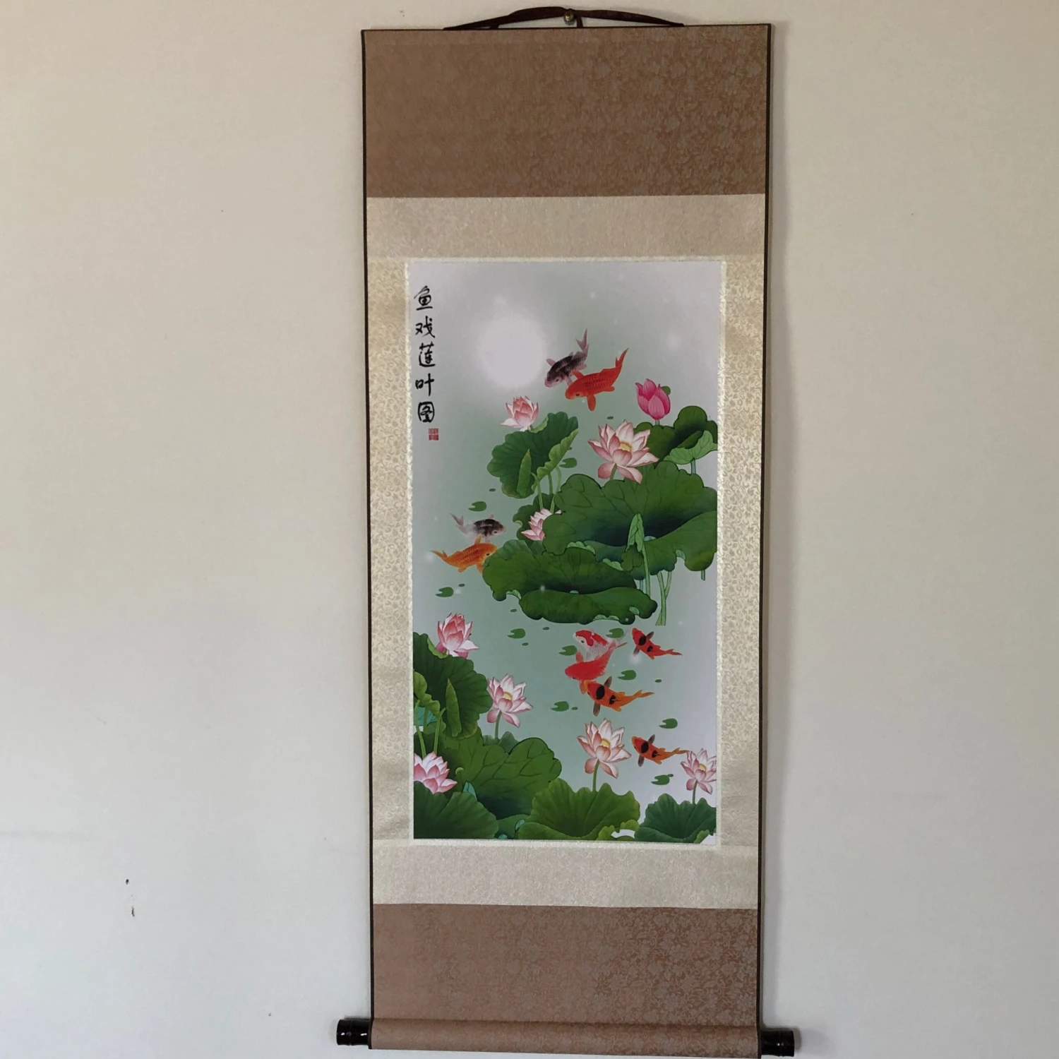 Traditional Chinese design of lotus flowers, fish and calligraphy. Print in pinks, orange, browns, red, blues, greens. Chinese character meaning: Peacock dances on a branch. Embossed golden and ivory silk at top and base of scroll, lacquered timber in dark stain at base and chocolate silk hanging cord.