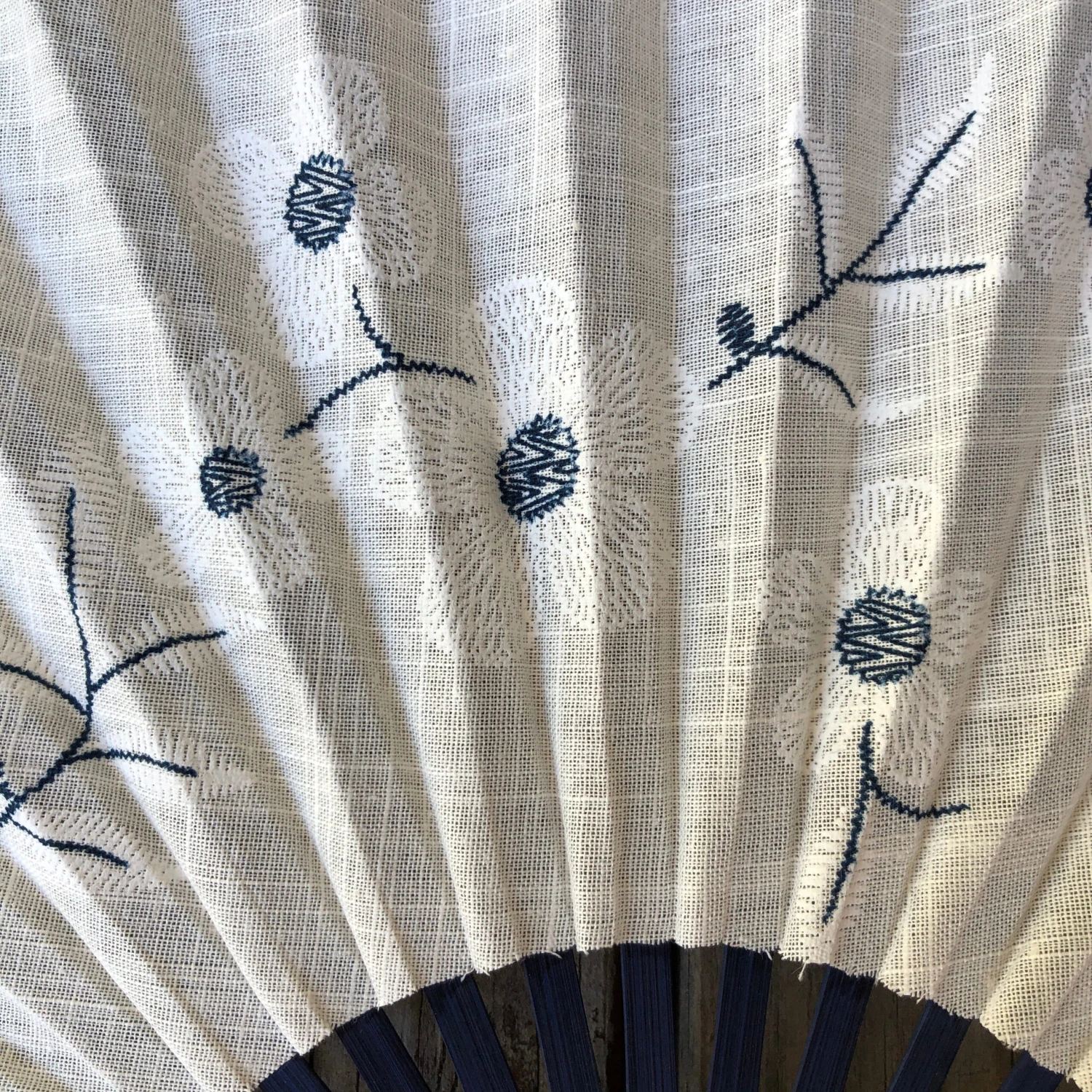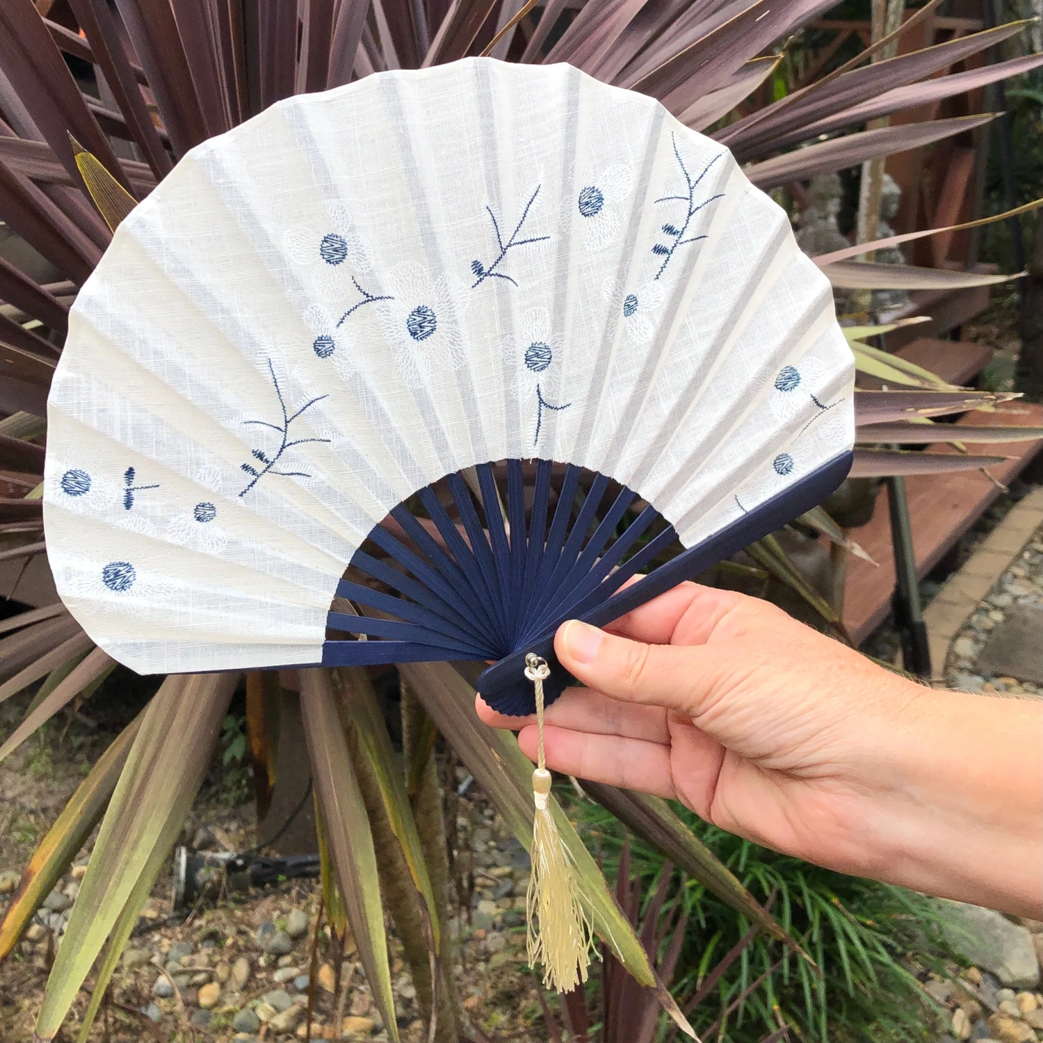 Luxury range, beautifully hand crafted and finished quality linen fan with dark blue bamboo frame. Ivory Linen fabric with embroided flowers design in ivory/white and dark blue threads with ivory tassel tail. Stunning shaped hand fan.