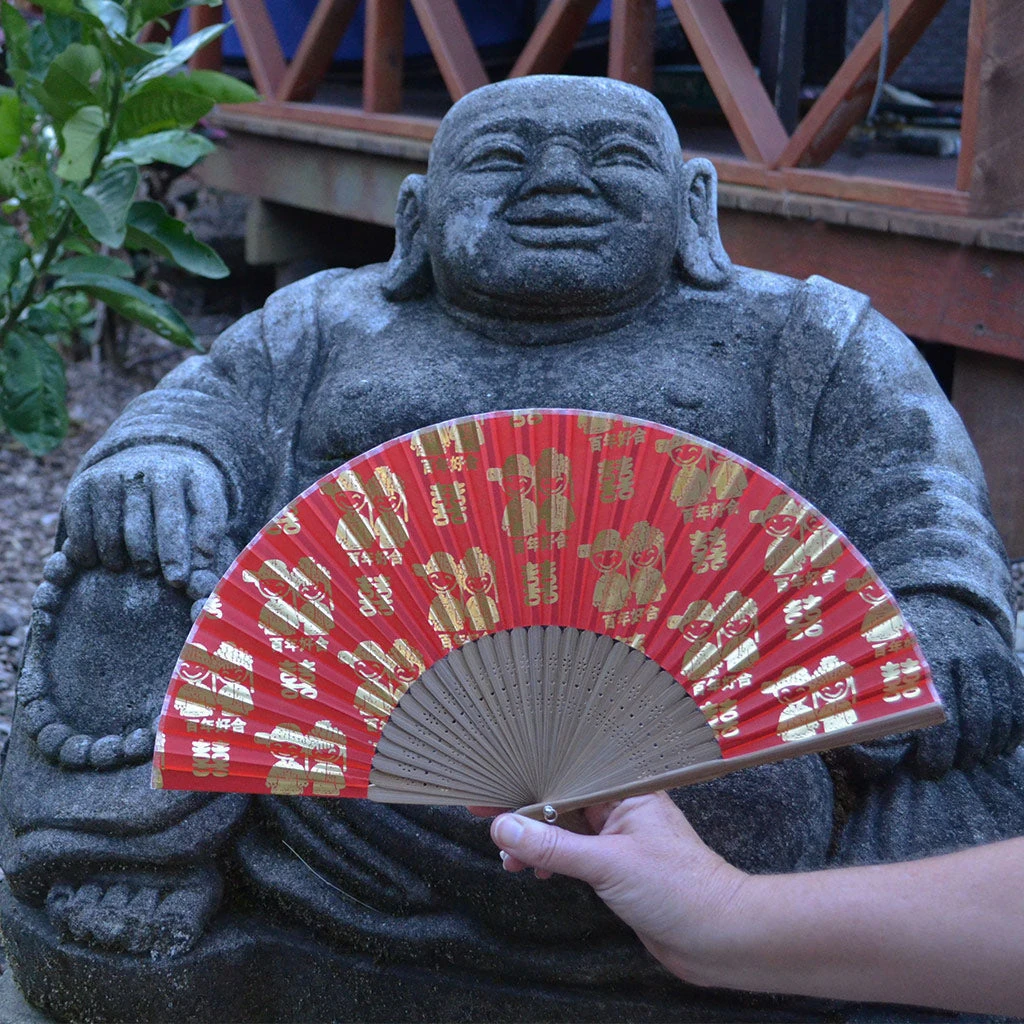 End of stock design sale – Highest quality, beautiful red Chinese silk fan with metallic gold print – with dark lacquered bamboo framing with intricate carving.
