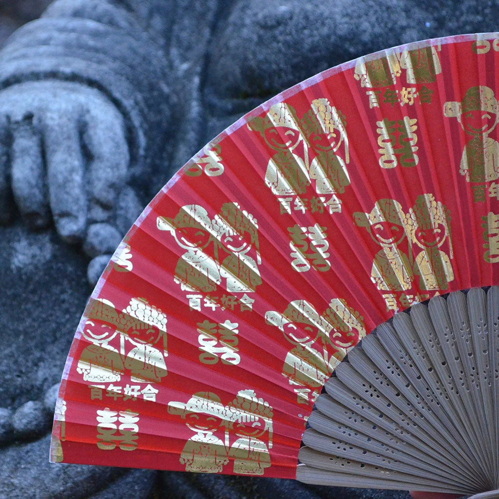 Exquisite wedding hand fan, bride and groom and double happiness design. (Chinese characters meaning – Harmonious union lasting a hundred Years