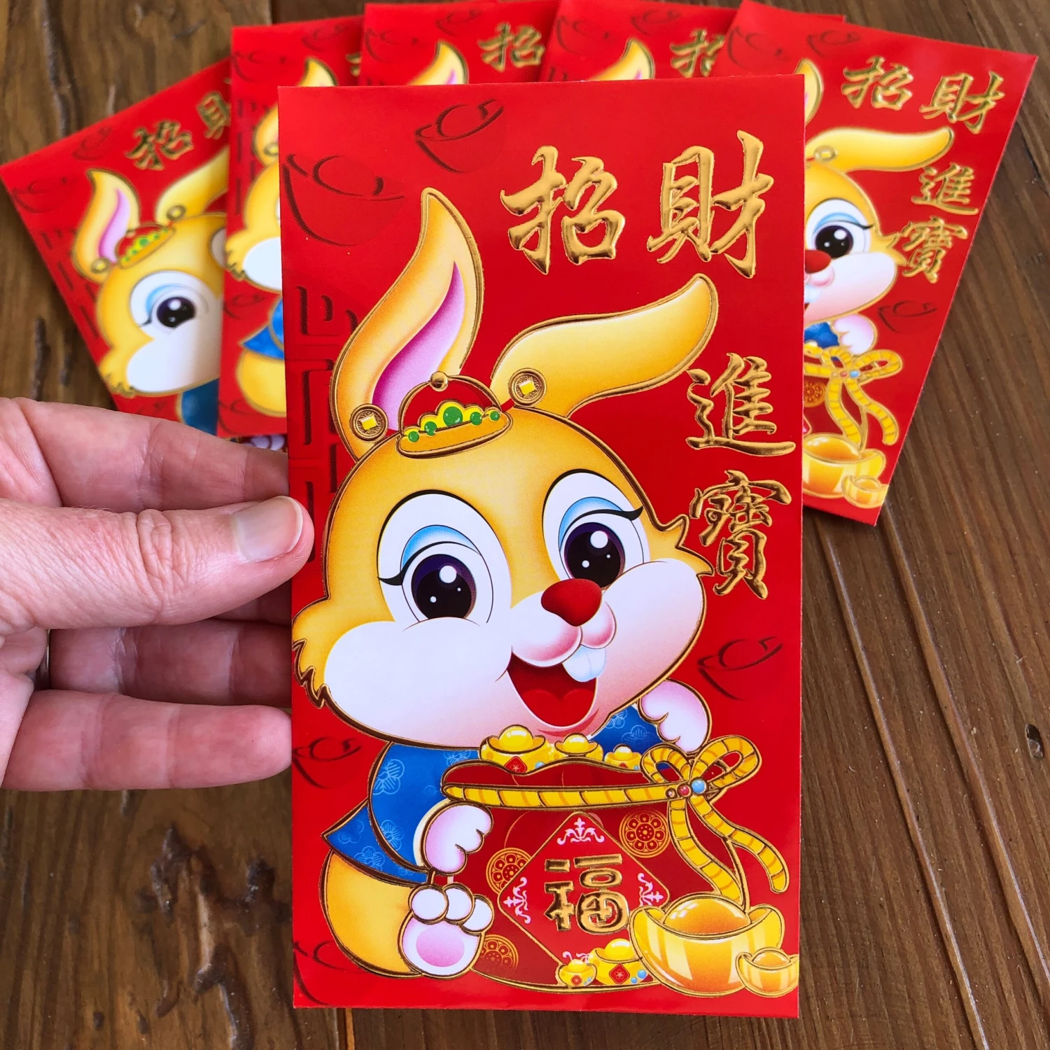 Vibrant red paper envelopes with rabbit and traditional decoration of ingots with Chinese characters for good luck, prosperity and traditional blessings for new year (6 per pack all with same design of yellow rabbit).
