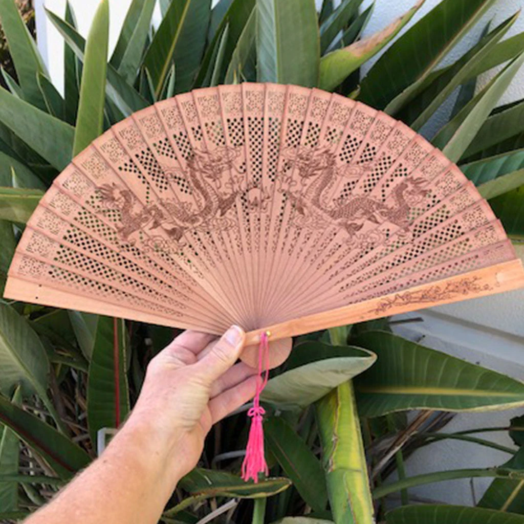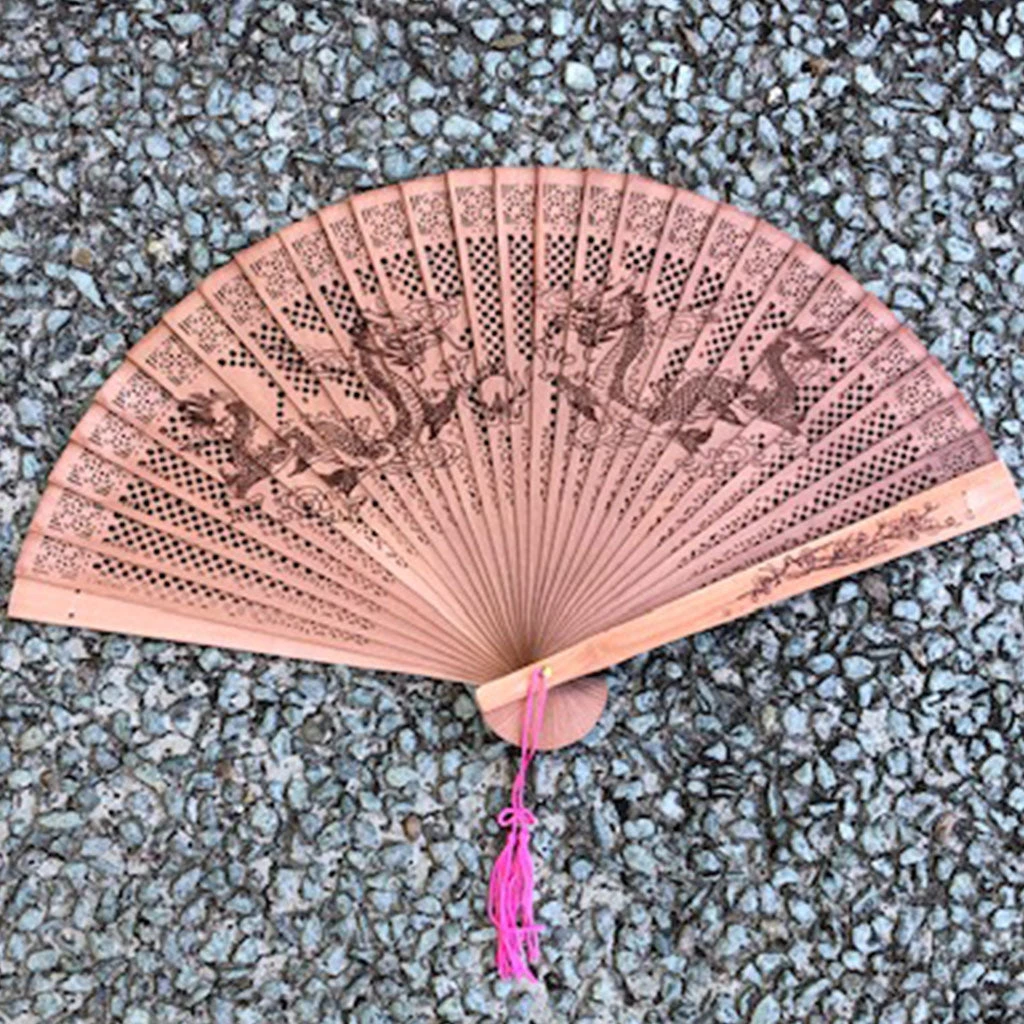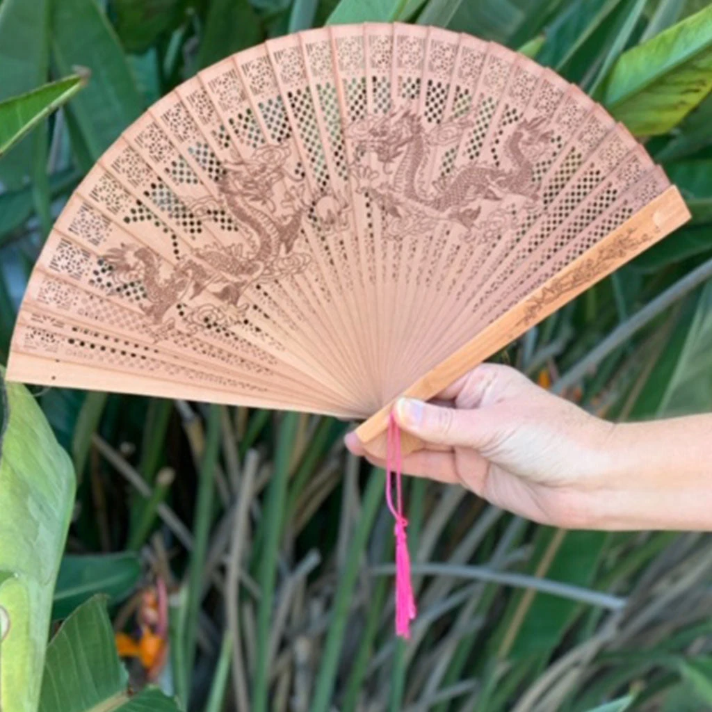 Stunning fragrant sandalwood fan with a pair of dragons and cherry blossom decoration. Traditional design wood fans with intricate carved design and coloured Chinese knot hanging decoration for good luck. Print on both sides of fan (see video)