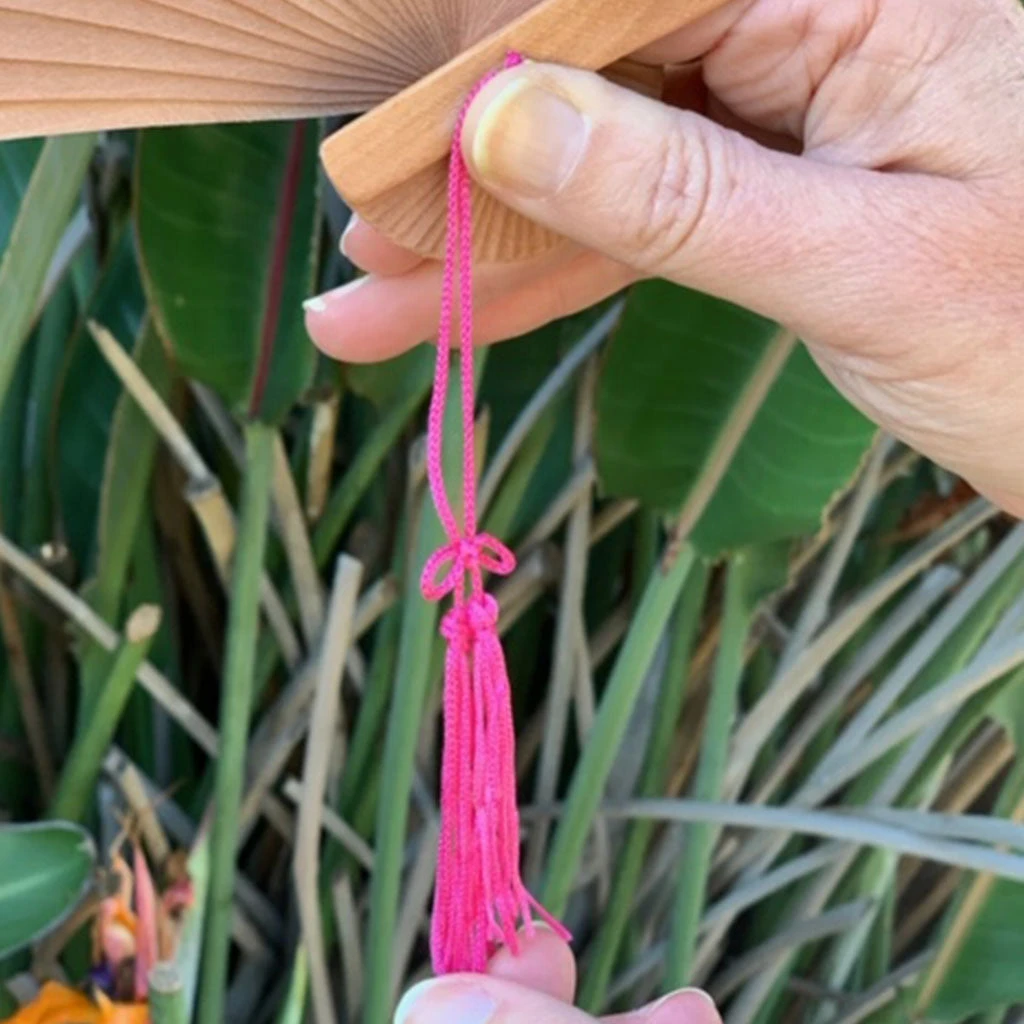 Sandalwood timber fan with clear thread which holds all fan spines in place. Highest quality natural sandalwood so may be some variance between timber colour shades and tassel colours.