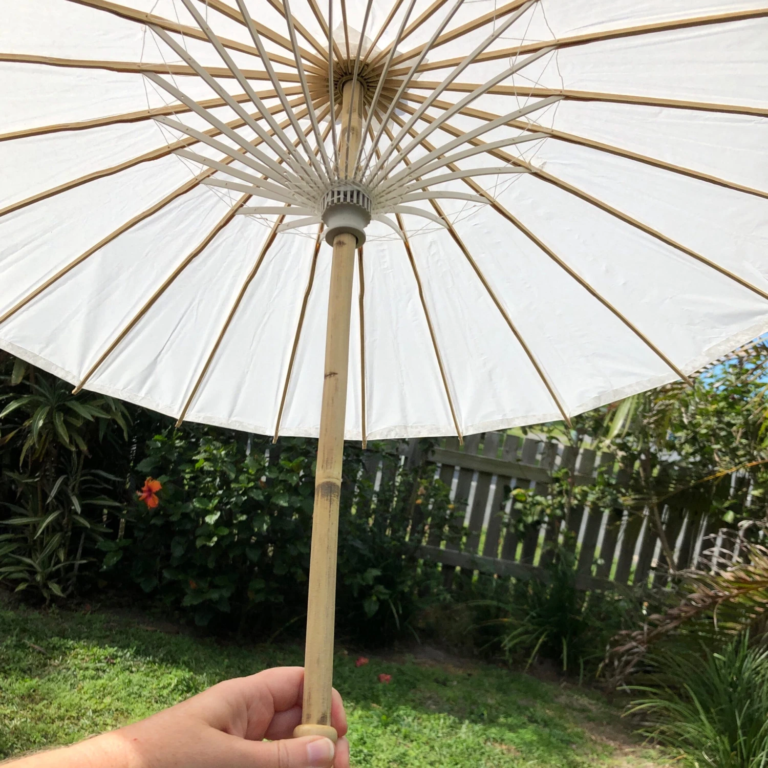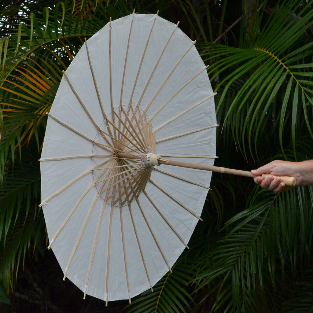 Paper parasol with bamboo framing and lacquered handle. Beautifully finished with matching paper-covered end-tip, (no plastic is exposed), so you will have beautiful wedding photos! Highest grade, clean finish paper is used in these hand-crafted parasols. White paper, light coloured bamboo and plastic framing with white cotton string threading on underside. See images and video.