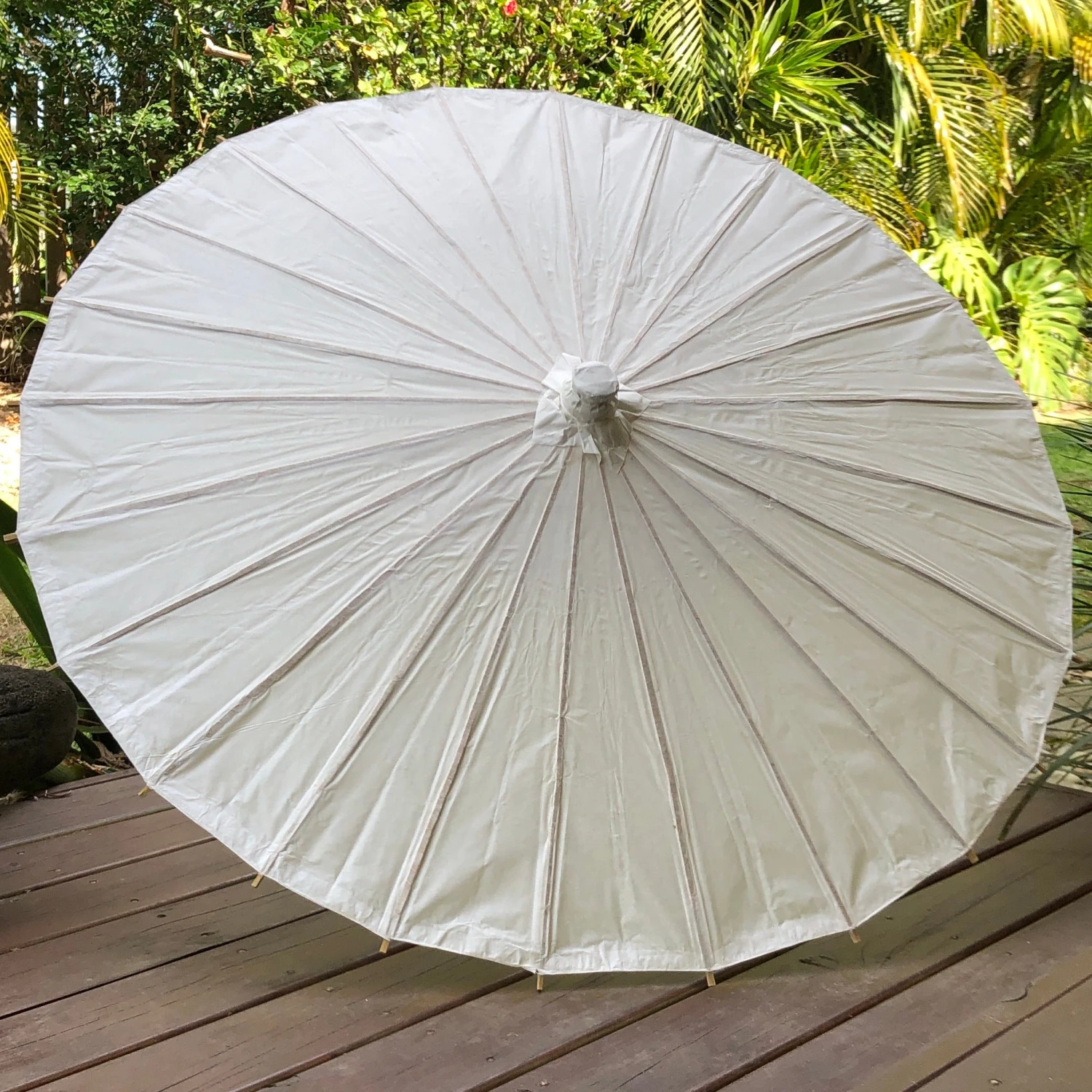 Deluxe finish, quality traditional white paper parasol. Our most popular and best-selling wedding parasol. Great value paper parasol. White paper is a slightly warm white colour.