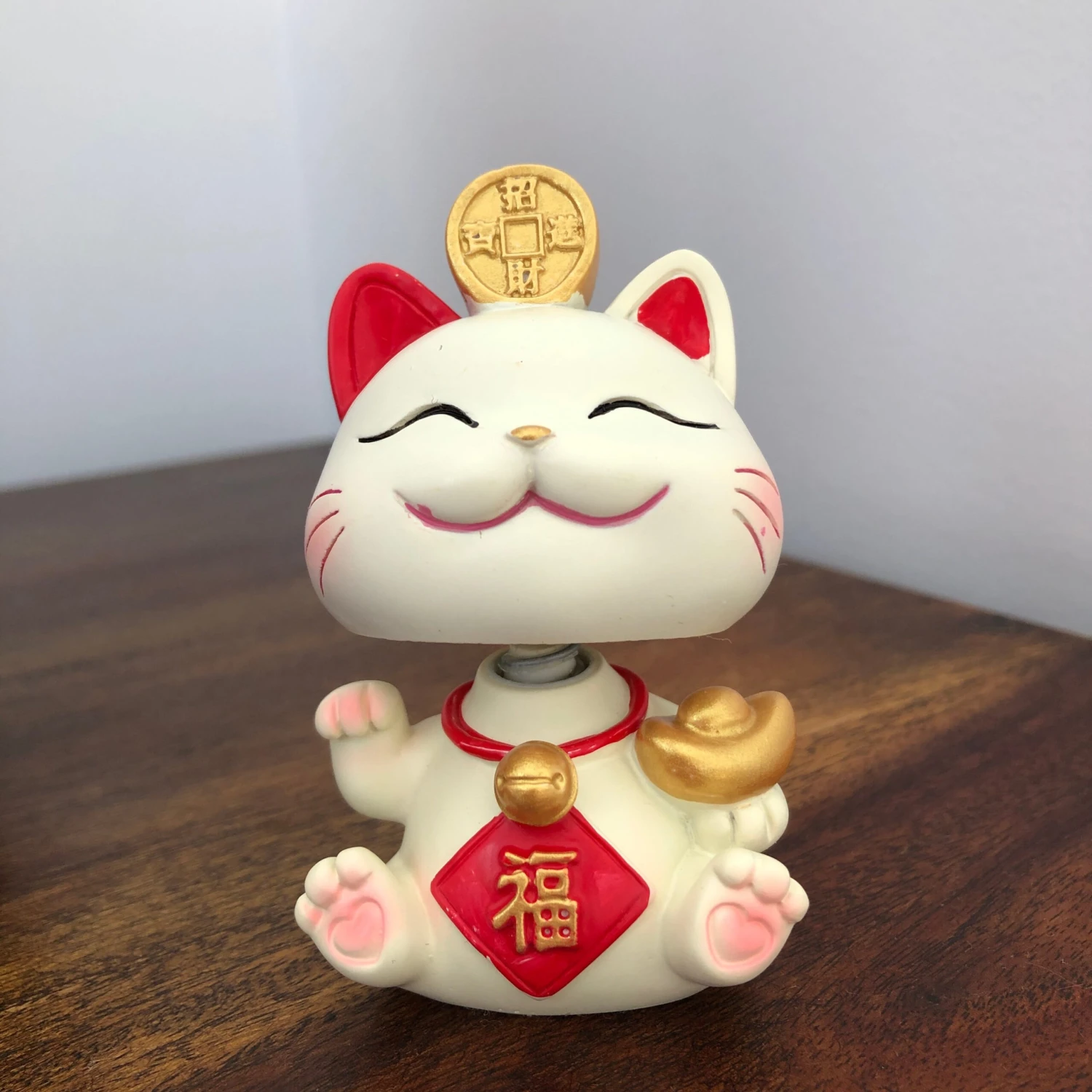 Cute wobble head lucky cat! Bring good luck and good fortune with this lucky waving cat. Chinese characters for luck, wealth, fortune, prosperity.